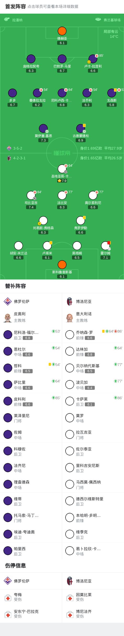 第25分钟,马里乌龙助攻,卡斯特罗抽射破门,博洛尼亚1-0佛罗伦萨
