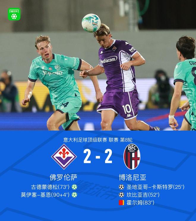 北京时间10月27日,意甲联赛第8轮,佛罗伦萨坐镇主场迎战博洛尼亚。比赛开始后,博洛尼亚率先打破僵局,圣地亚哥-卡斯特罗攻入一球,帮助球队取得领先。下半场,霍尔姆送出助攻,坎比亚吉接球后破门得分,进一步扩大优势。随后,佛罗伦萨通过点球机会由古德蒙德松扳回一城。比赛进入尾声阶段,霍尔姆因累计两张黄牌被罚离场。补时最后时刻,佛罗伦萨再次获得点球,莫伊塞-基恩主罚命中,完成绝平。最终全场比赛结束,双方以2比2握手言和。
